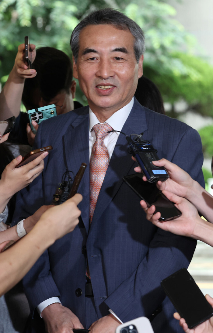 Min Joong-ki, the independent counsel named to lead a probe into former first lady Kim Keon Hee over various allegations, speaks to reporters on arrival at a temporary office in Seoul on June 25, 2025. (Yonhap)