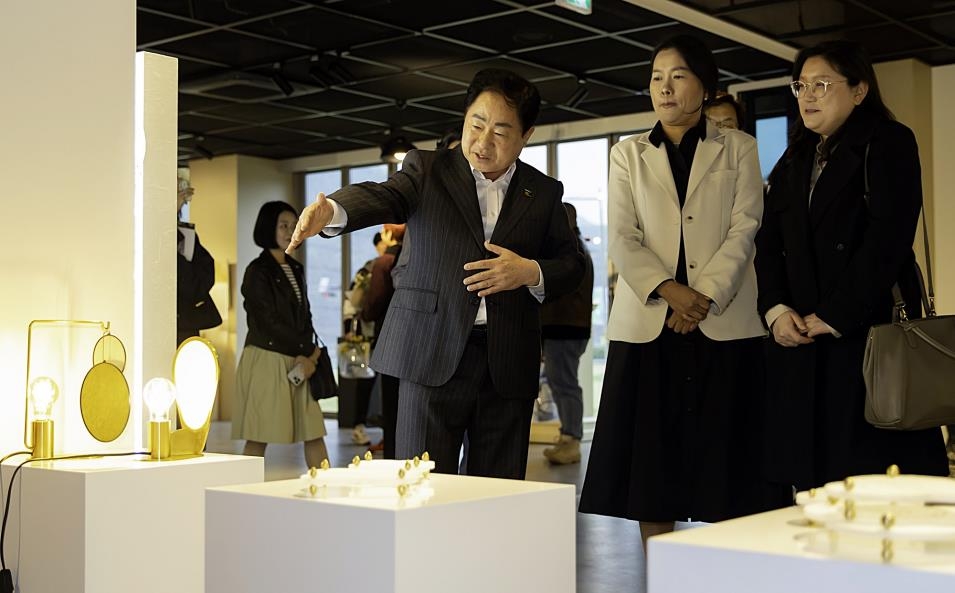 | ▲ 남양주 예술가 전시 공간 '더 나르떼' 개관 (남양주=연합뉴스) 주광덕 경기 남양주시장이 지난 11일 조안면 정약용 펀그라운드 별관에 조성된 지역 예술가 전시 공간 '더 나르떼'에서 작품을 관람하고 있다. 2023.4.12 [남양주시 제공. 재판매 및 DB 금지] |
