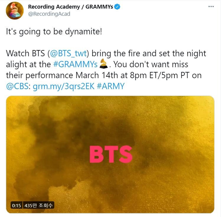 "It's going to be dynamite! Watch BTS bring the fire set the night alight at the Grammys," the Recording Academy said in its Twitter posting, citing the lyrics of BTS' hit song "Dynamite."