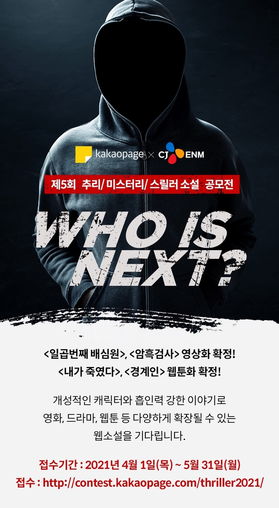 (서울=연합뉴스) 이정현 기자 = CJ ENM과 카카오페이지가 '제5회 추리, 미스터리, 스릴러 소설 공모전'을 개최한다고 1일 밝혔다.