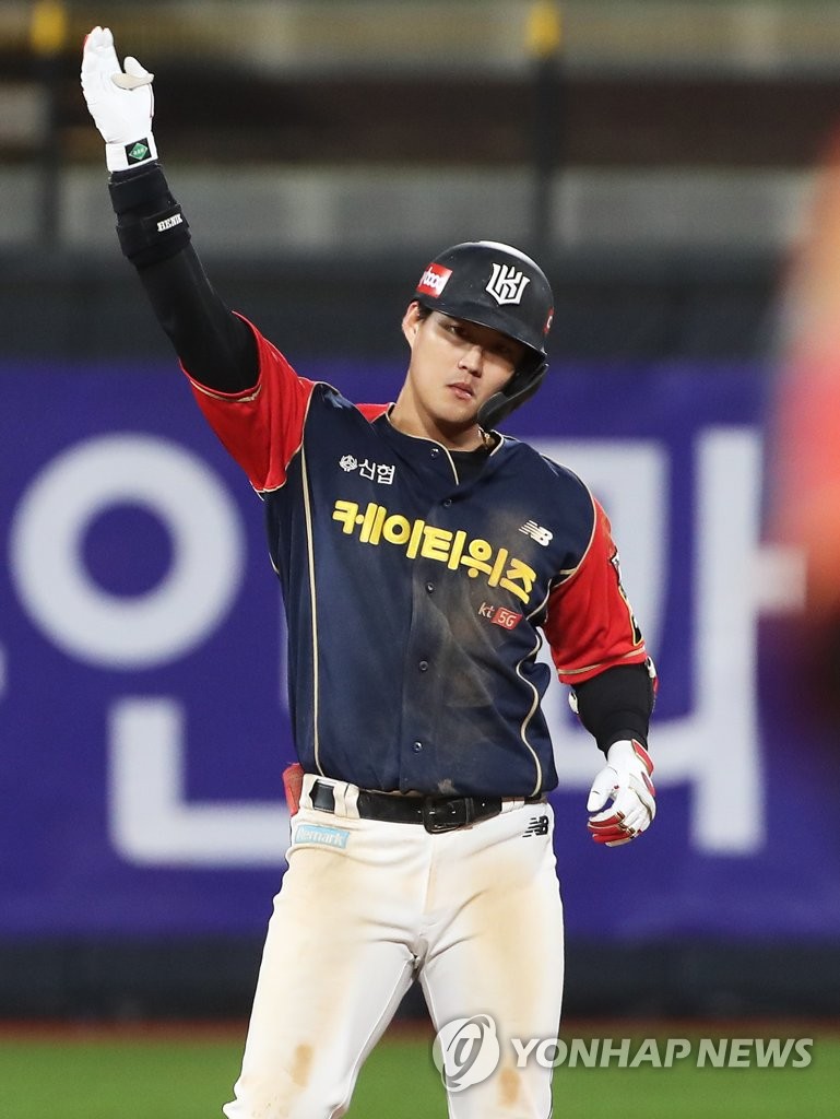 | ▲  In this file photo from Oct. 27, 2021, Bae Jung-dae of the KT Wiz celebrates his RBI double against the NC Dinos in the bottom of the sixth inning of a Korea Baseball Organization regular season game at KT Wiz Park in Suwon, some 45 kilometers south of Seoul. (Yonhap) |