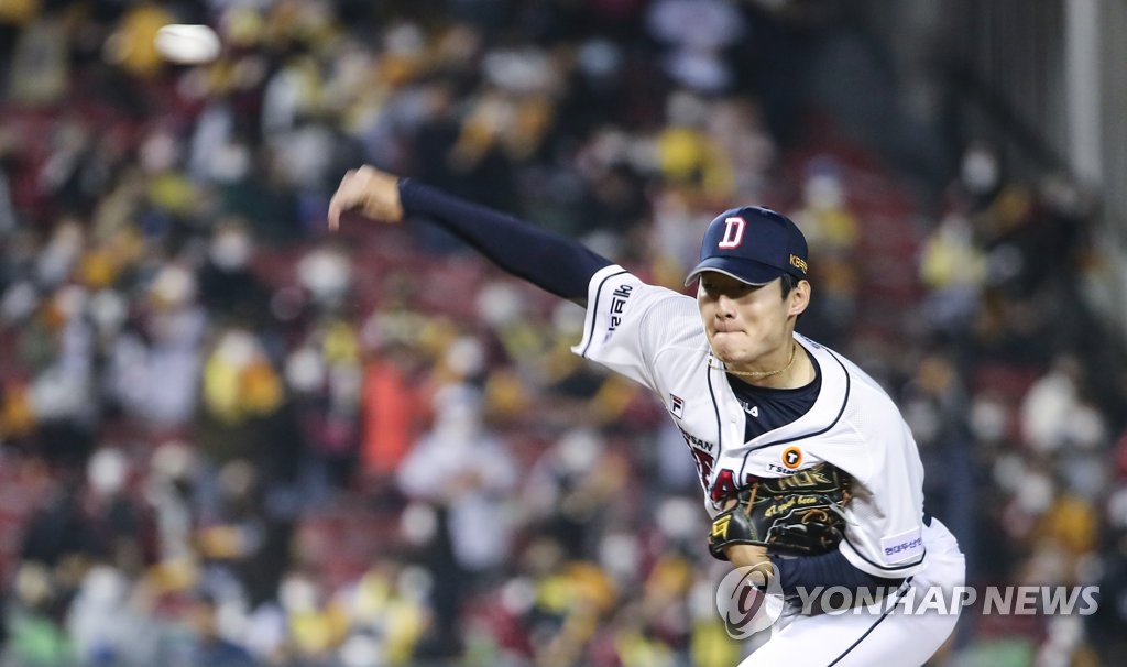 | ▲  Doosan Bears starter Gwak Been pitches against the LG Twins in the top of the first inning during Game 2 of the first round in the Korea Baseball Organization postseason at Jamsil Baseball Stadium in Seoul on Nov. 5, 2021. (Yonhap) |