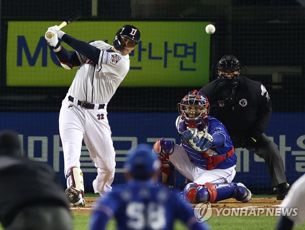 | ▲  Kim Jae-hwan of the Doosan Bears hits an RBI single against the Samsung Lions in the bottom of the first inning during Game 2 of the second round in the Korea Baseball Organization postseason at Jamsil Baseball Stadium in Seoul on Nov. 10, 2021. (Yonhap) |