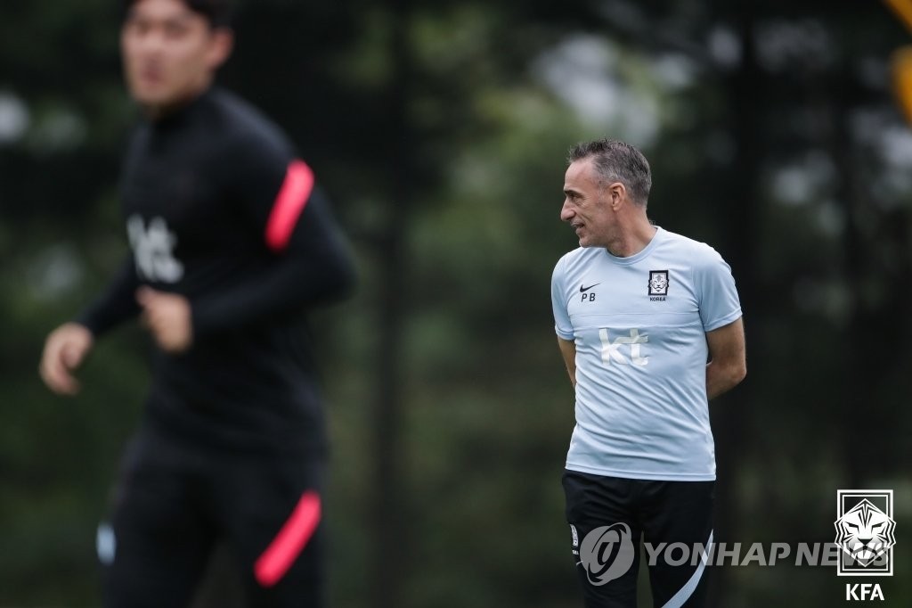 | ▲ Paulo Bento (R), head coach of the South Korean men's national football team, watches his players during a training session at the National Football Center in Paju, Gyeonggi Province, on Oct. 5, 2021, in preparation for 2022 FIFA World Cup qualifying matches, in this photo provided by the Korea Football Association. (PHOTO NOT FOR SALE) (Yonhap) |