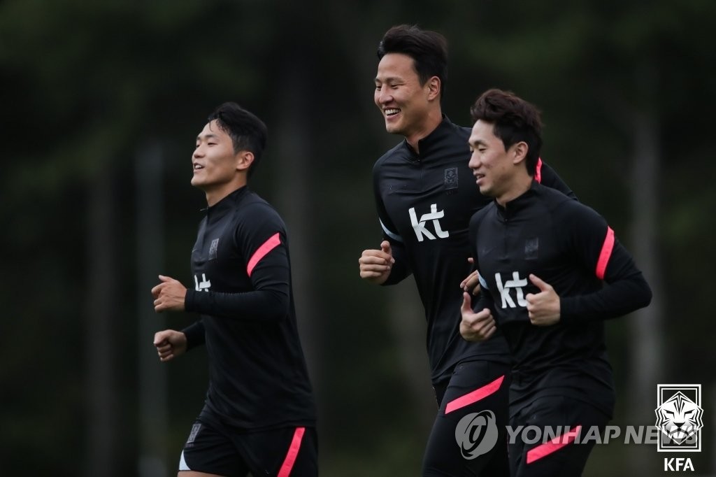 | ▲ From left: Na Sang-ho, Kwon Kyung-won and Kang Sang-woo of the South Korean men's national football team train at the National Football Center in Paju, Gyeonggi Province, on Oct. 5, 2021, in preparation for 2022 FIFA World Cup qualifying matches, in this photo provided by the Korea Football Association. (PHOTO NOT FOR SALE) (Yonhap) |