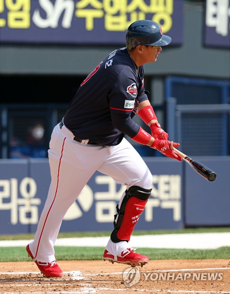 | ▲  Lee Dae-ho of the Lotte Giants watches his line drive to second base against the LG Twins during the top of the fourth inning of a Korea Baseball Organization preseason game at Jamsil Baseball Stadium in Seoul on March 27, 2022. (Yonhap) |