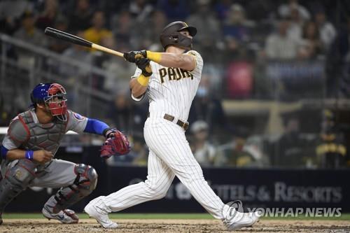 | ▲ In this Getty Images file photo from June 7, 2021, Brian O'Grady of the San Diego Padres hits a two-run home run against the Chicago Cubs during the bottom of the third inning of a Major League Baseball regular season game at Petco Park in San Diego. (Yonhap) |