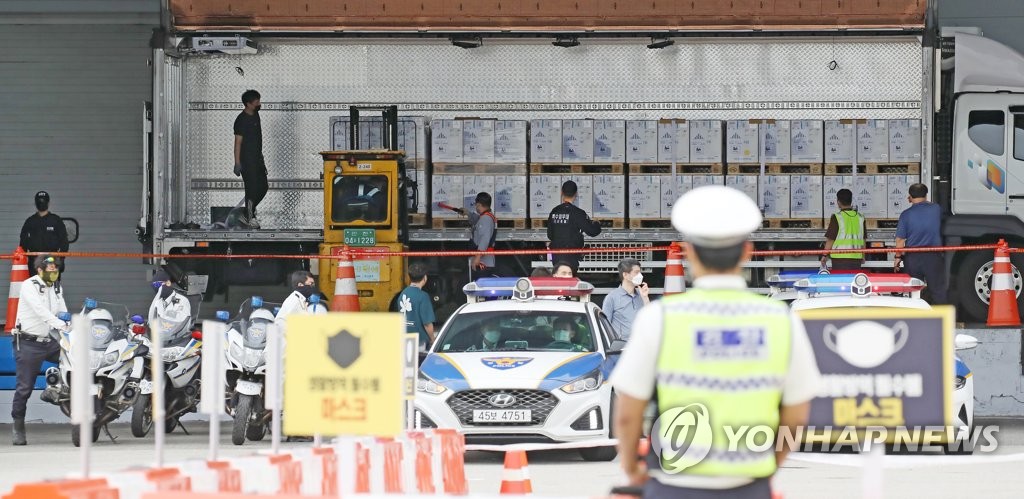 | ▲ Officials load boxes of Pfizer's COVID-19 vaccine on a truck at Incheon International Airport, west of Seoul, on Sept. 1, 2021. (Yonhap) |
