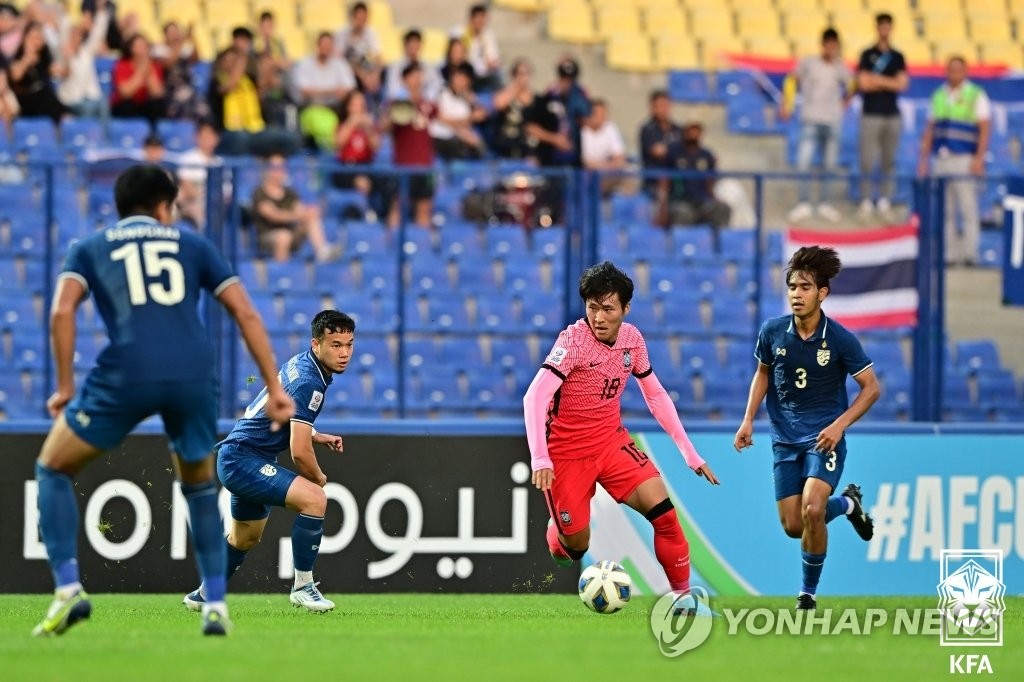| ▲ 패스 줄 곳 찾는 정상빈 (서울=연합뉴스) 지난해 6월 8일 우즈베키스탄 타슈켄트 파흐타코르 중앙경기장에서 열린 2022 아시아축구연맹(AFC) U-23 아시안컵 조별리그 C조 3차전 한국과 태국의 경기. 정상빈이 드리블을 하고 있다. 2022.6.9 [대한축구협회 제공. 재판매 및 DB 금지] photo@yna.co.kr |