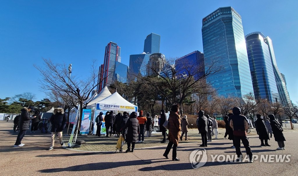 | ▲ This photo taken on Dec. 25, 2021, shows people lined up to take coronavirus tests at a makeshift testing center Seoul. (Yonhap) |