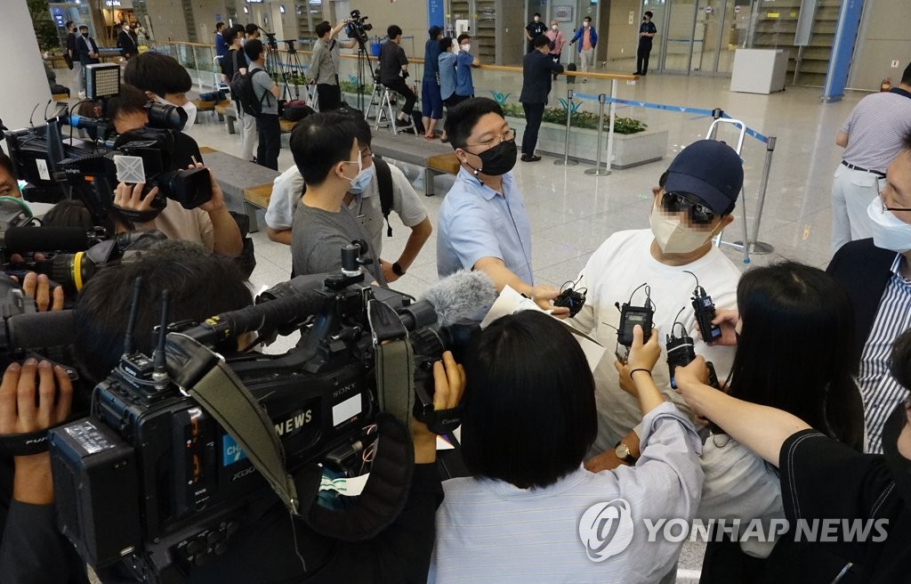| ▲ 귀국한 비상착륙 승객들 (영종도=연합뉴스) 한상균 기자 = 대한항공 기체 결함으로 대체 항공기를 타고 귀국한 승객들이 11일 오전 인천공항에서 취재진의 질문에 답하고 있다. 9일 튀르키예(터키) 이스탄불에서 인천국제공항으로 향하던 대한항공 여객기는 기체 결함으로 아제르바이잔 수도 바쿠에 긴급 착륙했다. 승객들은 대한항공 임시편으로 이날 인천공항을 통해 귀국했다. 2022.7.11 xyz@yna.co.kr |
