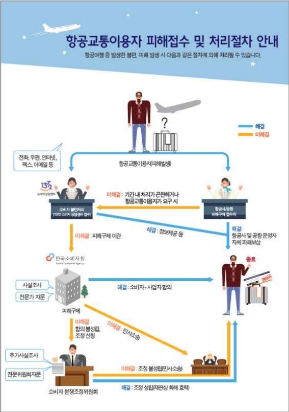 통상 항공 승객의 피해가 발생했을 때 항공사·공항 피해구제 접수처나 1372 소비자 상담센터를 통해 피해를 접수하게 된다.