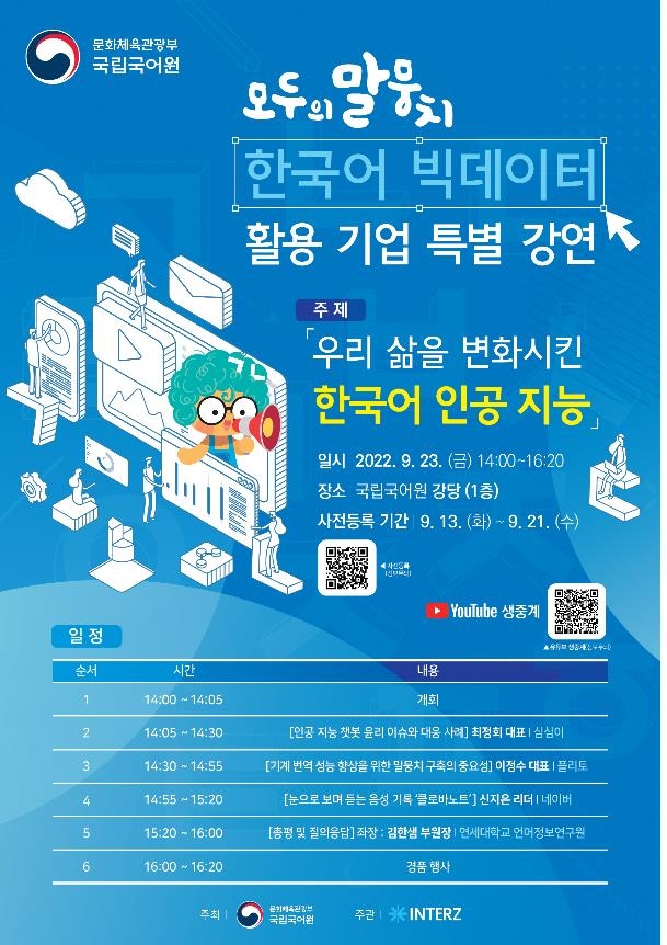 ▲ 국립국어원, 한국어 인공지능 특별강연 = 국립국어원은 23일 강당에서 '우리 삶을 변화시킨 한국어 인공지능'을 주제로 한 특별 강연을 연다.