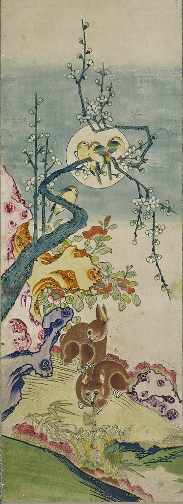 전시에 나오는 한국 판화 중에는 여러 색으로 찍은 채색 판화 '달과 토끼'가 돋보인다. 꽃과 새를 함께 그린 화조도 花鳥圖)의 일종인 이 판화에는 두 마리 토끼가 몸을 웅크리고 있다.