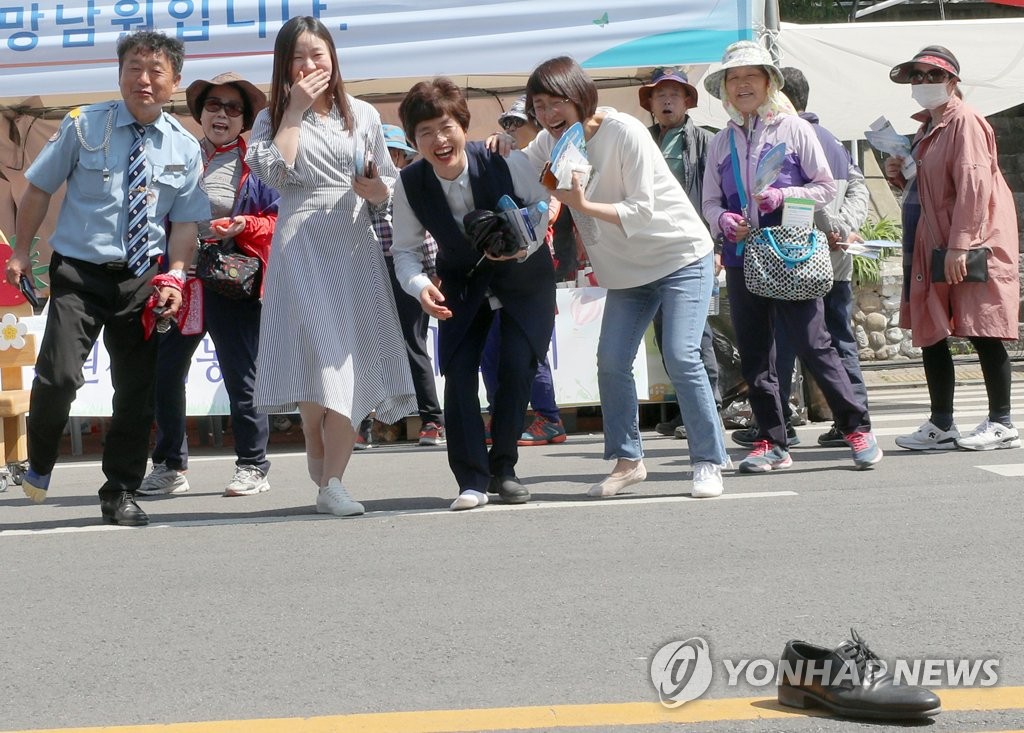 | ▲ 동심으로 돌아간 어른들 (남원=연합뉴스) 백도인 기자 = 제89회 춘향제가 열리는 전북 남원시 광한루원 앞에서 어른들이 신발을 원 안에 넣는 게임을 하며 어린아이처럼 즐거워하고 있다. 2019.5.10 |