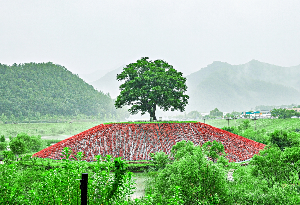 군은 섬 사면에 붉은 매자나무를 심어 봄부터 가을까지 느티나무의 초록과 대비되는 환상적인 풍경을 연출하고 있다.