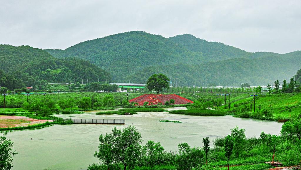 호수 배경 초록 느티나무 우뚝…사면 붉은 매자나무 대비
