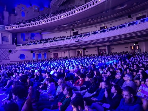 Fans listen to South Korean director Bong Joon-ho during his master class hosted by Thierry Fremaux, head of the Cannes Film Festival, at a theater in Paris on Feb. 26, 2023. (Yonhap)