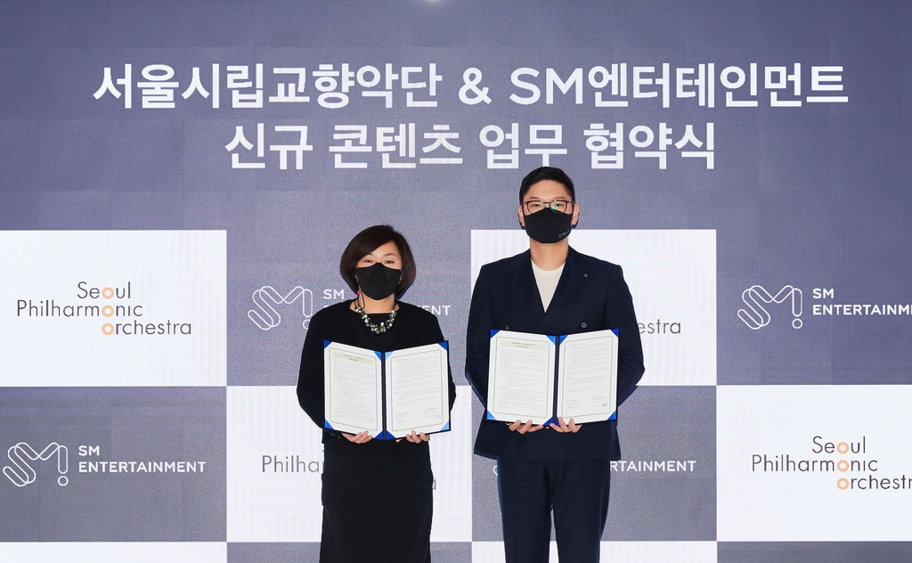 (서울=연합뉴스) 이태수 기자 = SM엔터테인먼트는 10일 서울 성동구 SM 성수 신사옥에서 서울시립교향악단과 '장르 간 협업을 통한 문화 콘텐츠의 확장 및 발전에 대한 업무협약'을 맺었다고 11일 밝혔다.