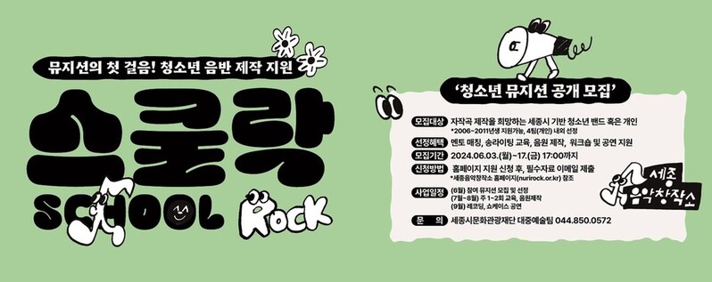 신청 자격은 자작곡 제작에 관심이 있으며 세종시에 거주하는 2006년생부터 2011년생 청소년이다. 개인은 물론 단체로도 신청할 수 있다.