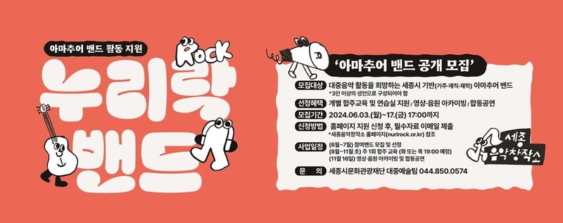 (세종=연합뉴스) 이은파 기자 = 세종시문화관광재단은 청소년과 성인을 대상으로 대중음악 활동을 지원하는 '스쿨락'과 '누리락 밴드' 참여자를 오는 17일까지 모집한다고 3일 밝혔다.