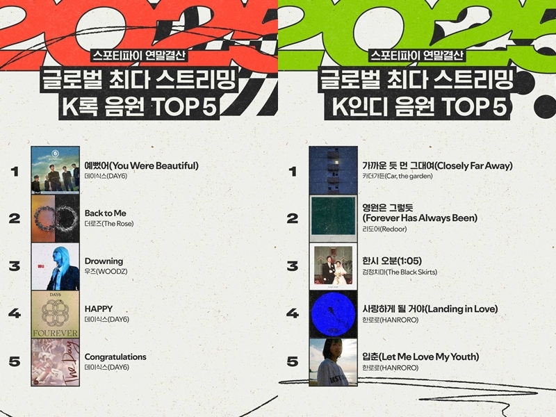 데이식스는 스포티파이 국내 이용자들이 록과 인디 장르를 통틀어 가장 많이 스트리밍한 가수로도 꼽혔다. 검정치마와 볼빨간사춘기가 각각 2위와 3위, 한로로와 십센치가 각각 4위와 5위였다.