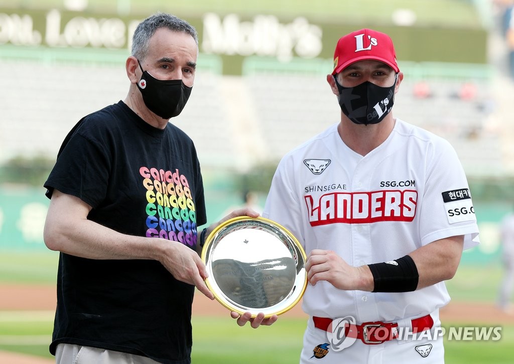 | ▲ In this file photo from July 1, 2021, Jamie Romak of the SSG Landers (R) receives the 2020 Tip O'Neill Award as the top Canadian baseball player for the year from Canadian Ambassador to South Korea Michael Danagher during a ceremony at Incheon SSG Landers Field in Incheon, 40 kilometers west of Seoul. (Yonhap) |