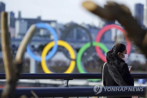 | ▲ (도쿄 AP=연합뉴스) 18일 일본 도쿄도(東京都)의 한 공원에서 마스크를 쓴 여성이 이동하고 있다. 신종 코로나바이러스 감염증(코로나19) 확산으로 도쿄 올림픽·패럴림픽이 개최될 수 있을지 불투명한 가운데 해상에 설치된 오륜 조형물이 보인다. |