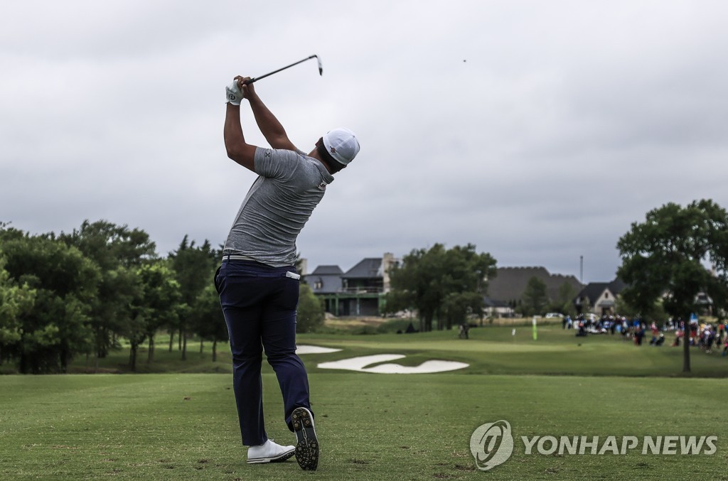 ▲ In this EPA photo, Lee Kyoung-hoon of South Korea tees off at the seventh hole during the final round of the AT&T Byron Nelson golf tournament at TPC Craig Ranch in McKinney, Texas, on May 16, 2021. (Yonhap)