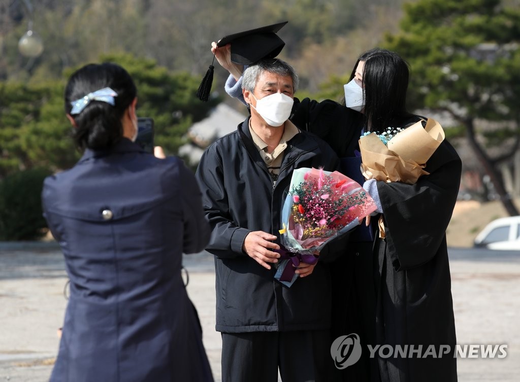 | ▲ A family wearing protective masks takes a photo during a graduation ceremony held at Dongshin University in Naju, 355 kilometers south of Seoul, on Feb. 22, 2021. (Yonhap) |
