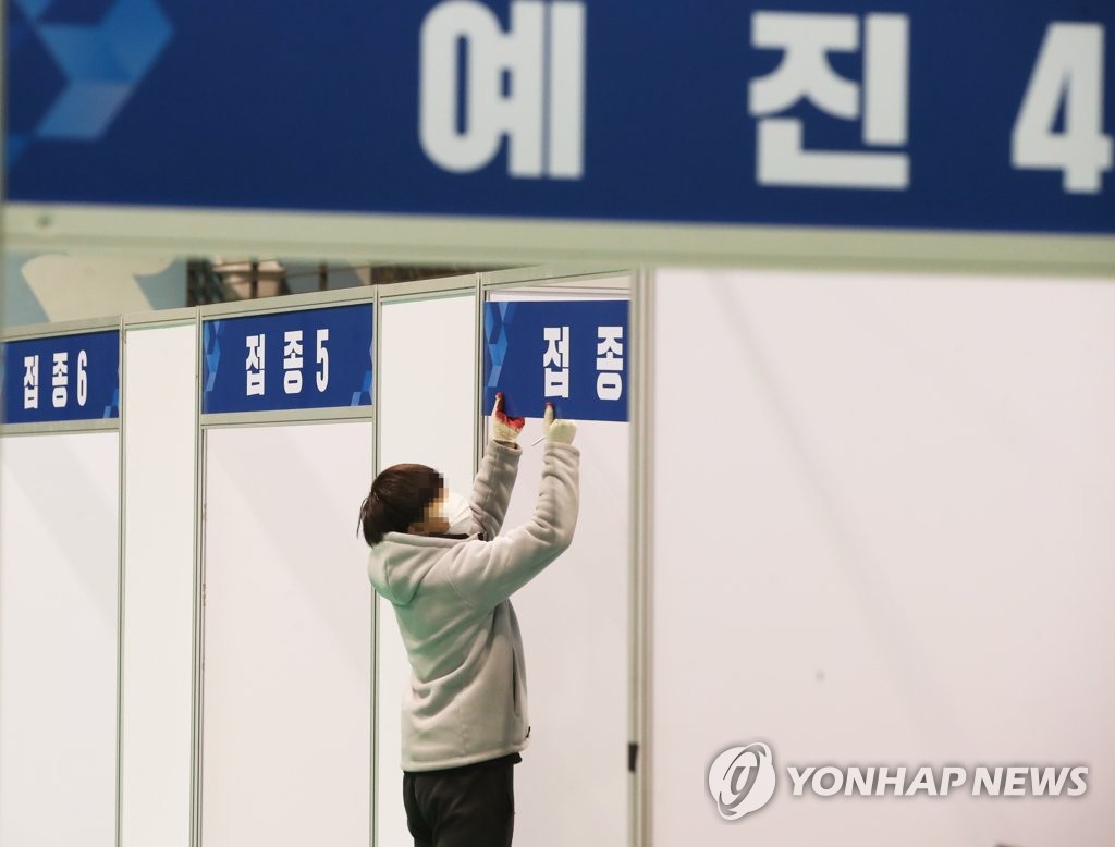 | ▲ A worker puts up signs at a makeshift COVID-19 vaccination center in Suwon, 46 kilometers south of Seoul, on Feb. 22, 2021. (Yonhap) |