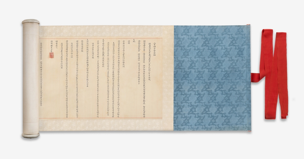(서울=연합뉴스) 임동근 기자 = 조선 숙종 때 공신들의 충성 맹세 기록을 담은 길이 24m의 왕실 최대 규모 문서 '이십공신회맹축-보사공신녹훈후'가 보물에서 국보로 승격됐다.