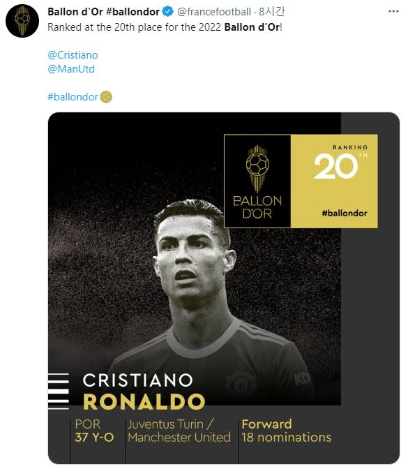 | ▲ 호날두, 올해는 20위 [발롱도르 트위터 캡처. 재판매 및 DB 금지] |