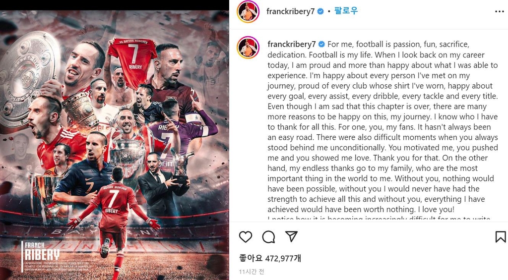 | ▲ 은퇴 소감을 전한 프랑크 리베리 [프랑크 리베리 인스타그램 캡처. 재판매 및 DB 금지] |