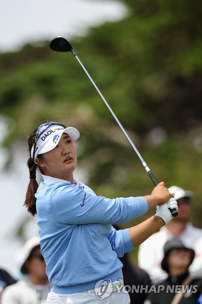 | ▲ In this Associated Press photo, Shin Ji-yai of South Korea tees off on the sixth hole during the final round of the U.S. Women's Open at Pebble Beach Golf Links in Pebble Beach, California, on July 9, 2023. (Yonhap) |