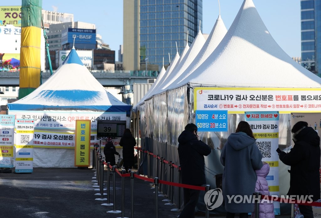 | ▲ People wait to take coronavirus tests at a pop-up screening clinic in front of Seoul Station on Jan. 11, 2022. South Korea's daily coronavirus cases stayed below 4,000 for the fifth consecutive day amid tightened antivirus restrictions to curb the spread of COVID-19. (Yonhap) |