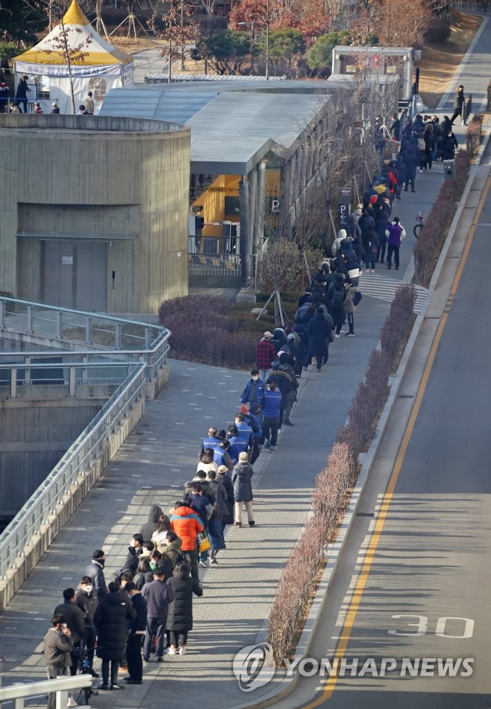 | ▲ People wait in line for coronavirus tests at a pop-up screening clinic in Seoul's Songpa Ward on Dec. 22, 2021. South Korea's new coronavirus cases spiked to above 7,000 the same day and the number of critically ill patients surged to a record high of 1,063. (Yonhap) |
