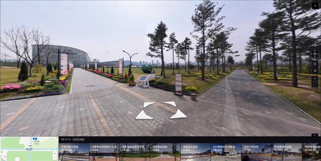 네이버 지도에서 '국립세종수목원'을 검색한 뒤 거리뷰 아이콘을 클릭하면 서비스 제공 구간이 파란색으로 활성화되며, 원하는 지점을 클릭하면 온라인으로 수목원을 관람할 수 있다.