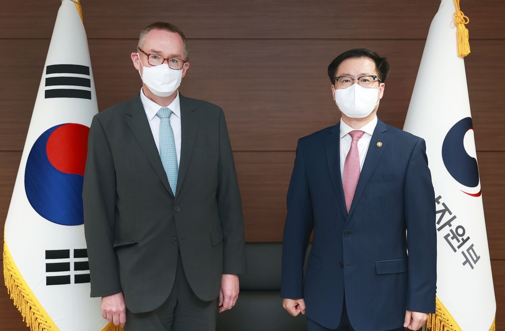 | ▲ South Korea's Trade Minister Yeo Han-koo (R) and British Ambassador to South Korea Colin Crooks pose for a photo ahead of their talks in Seoul on April 14, 2022, in this photo provided by Yeo's office. (PHOTO NOT FOR SALE) (Yonhap) |
