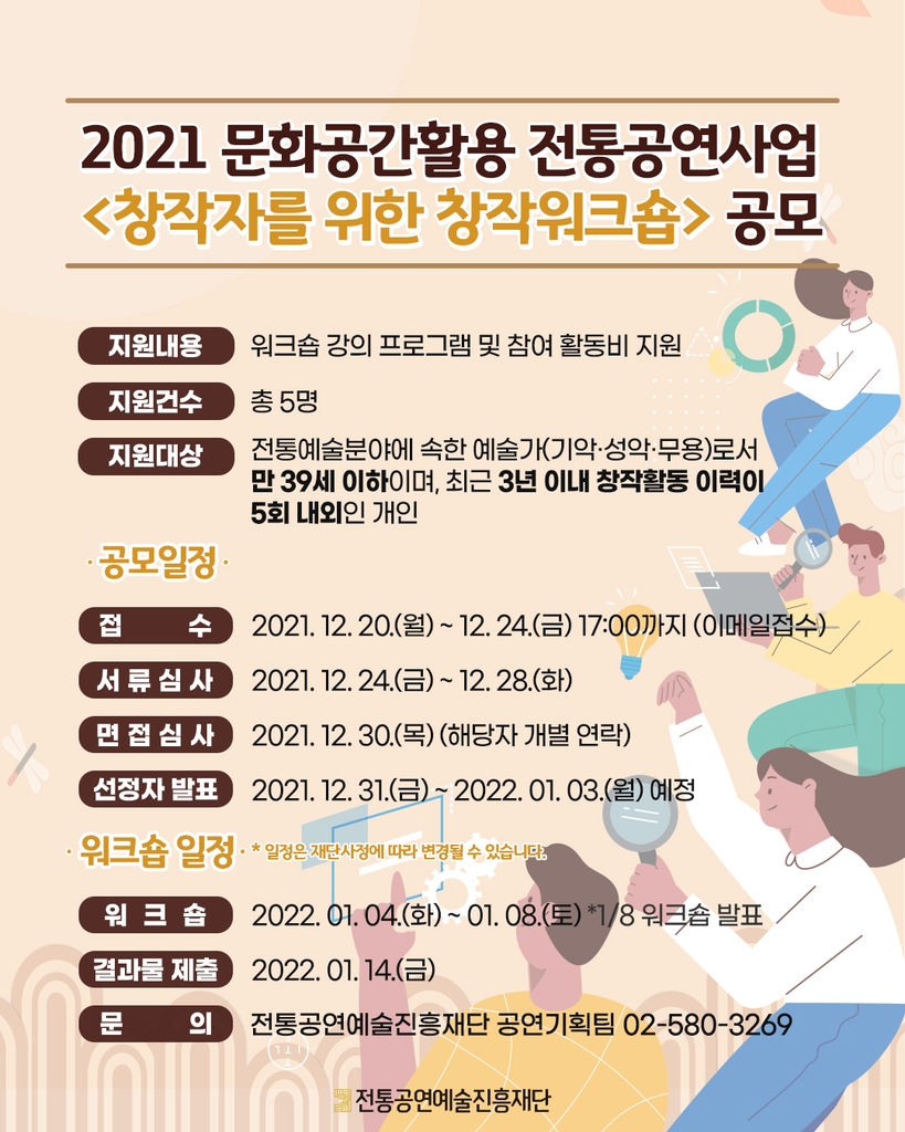 ▲ 전통공연예술진흥재단, '창작자를 위한 창작워크숍' 공모 = 전통공연예술진흥재단이 젊은 창작자들의 예술 활동을 지원하기 위한 '창작자를 위한 창작워크숍' 공모 참가자를 오는 20일부터 24일까지 모집한다.
