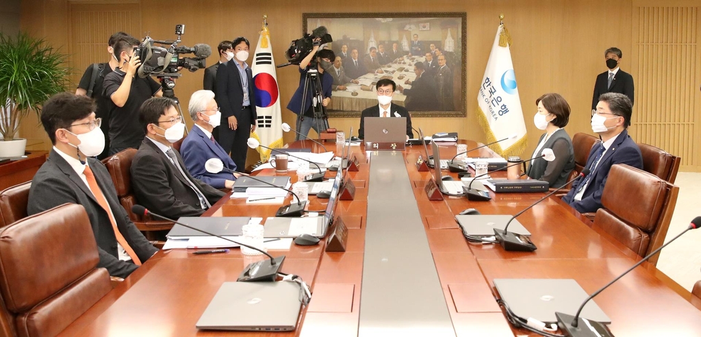 | ▲ BOK Gov. Rhee Chang-yong (C, rear) presides over a monetary policy board meeting at the central bank in Seoul on July 13, 2022, in this photo provided by the BOK. (PHOTO NOT FOR SALE) (Yonhap) |