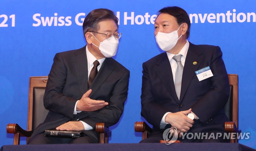 | ▲ 이재명ㆍ윤석열, 국가조찬기도회 참석 (서울=연합뉴스) 더불어민주당 이재명 대선 후보와 국민의힘 윤석열 대선 후보가 2일 오전 서울 서대문구 스위스그랜드호텔 컨벤션센터에서 열린 제53회 대한민국 국가조찬기도회에 참석해 대화하고 있다. 2021.12.2 [국회사진기자단] uwg806@yna.co.kr |