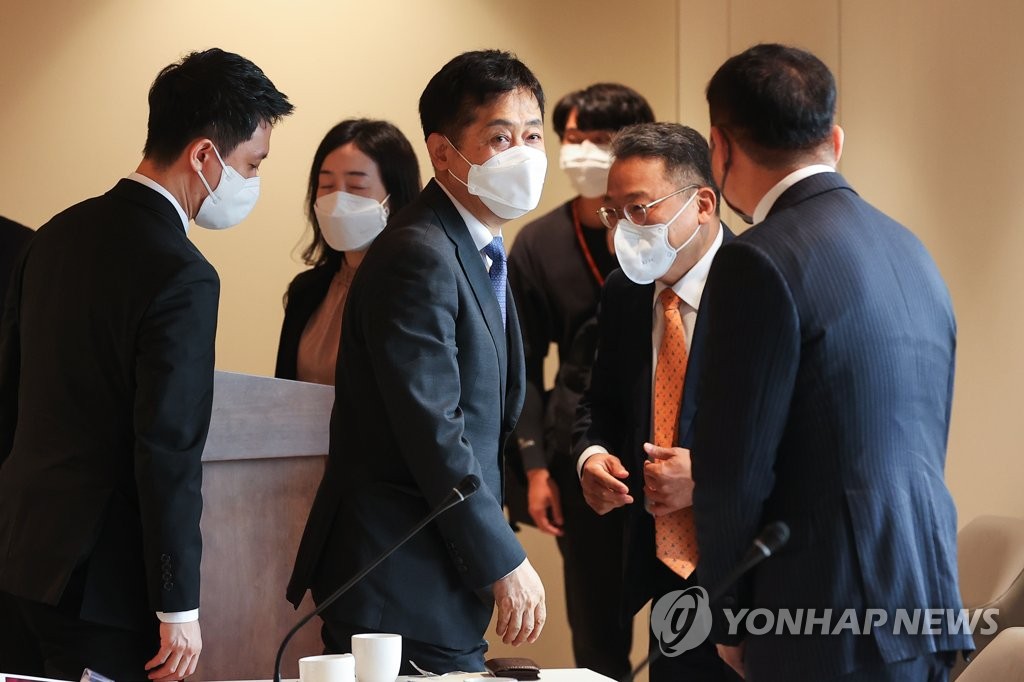 | ▲ FSC chief Kim Joo-hyeon (C) greets other officials before attending a meeting to discuss deregulation in the financial sector on July 19, 2022. (Yonhap) |