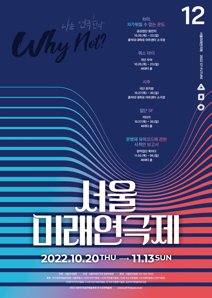 (서울=연합뉴스) 임지우 기자 = 기존 연극의 틀을 과감히 깬 작품들을 선보이는 서울미래연극제가 오는 20일부터 11월 13일까지 서울 홍익대 대학로 아트센터 소극장과 씨어터 쿰에서 열린다고 서울연극협회가 6일 밝혔다.