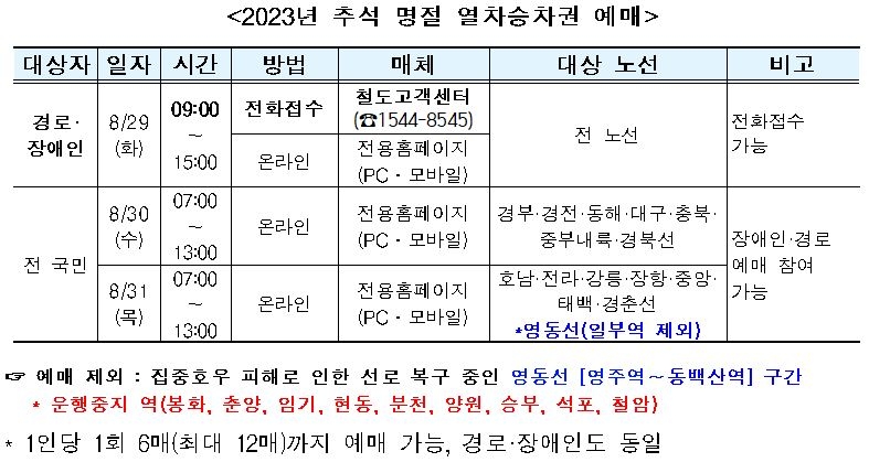 30∼31일은 경로·장애인을 포함한 모든 국민이 PC·모바일 등 온라인으로 추석 승차권을 예매할 수 있다.