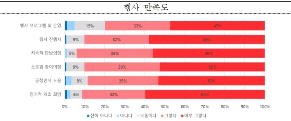 '만남 이후 지속적 만남 의향'에는 94%, '소모임 참여 의향'에는 90%가 긍정적으로 답했다.