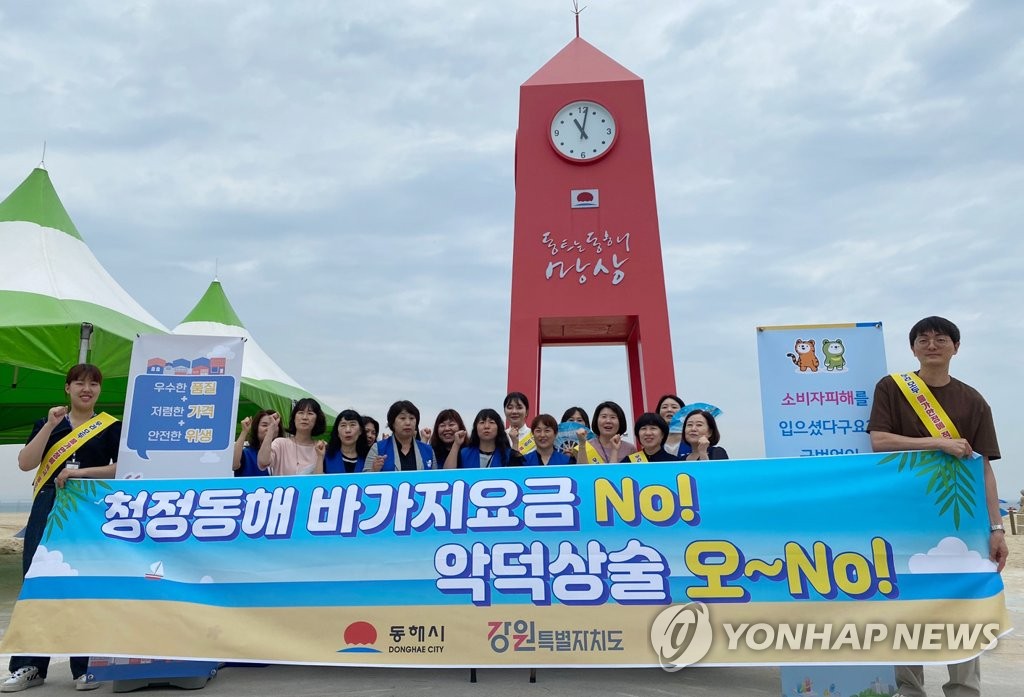| ▲ 동해 망상해변서 바가지요금 근절 캠페인 (동해=연합뉴스) 강원특별자치도와 동해시, 동해YWCA 회원 등이 13일 망상해수욕장에서 본격적인 여름 휴가철을 맞아 바가지요금 근절을 위한 합동 캠페인을 벌이고 있다. 2023.7.13[동해시 제공. 재판매 및 DB 금지] photo@yna.co.kr |