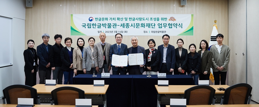 ▲ 국립한글박물관은 세종시문화재단과 '한글문화 가치 확산 및 한글사랑도시 조성을 위한 업무협약'을 체결했다고 15일 밝혔다. 양측은 한글 관련 전시·교육·문화행사를 비롯해 한글 특화 연계 사업을 할 때 서로 협력하며 세종시가 한글 관련 문화예술 도시인 '한글사랑도시'로 거듭나도록 힘을 모을 방침이다. (서울=연합뉴스)