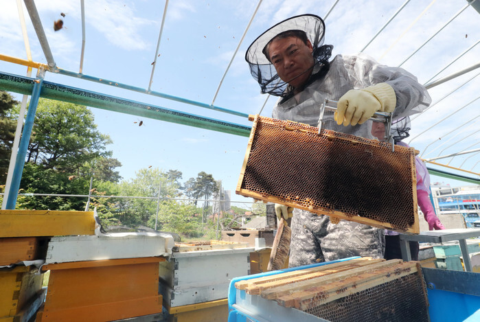 A bee farmer removes a frame full of acacia honey from a beehive at his honey farm in Cheongju, central South Korea, on May 12, 2022. (Yonhap)