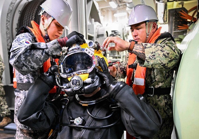 A deep sea diver of the South Korean Navy prepares to ride underwater transport equipment in waters off Changwon, South Gyeongsang Province, southeastern South Korea, on April 8, 2025, during a regular naval exercise between South Korea and the United States that is aimed at improving capabilities in combined maritime salvage and rescue operations, in this photo released by the Navy on April 10. (PHOTO NOT FOR SALE) (Yonhap)